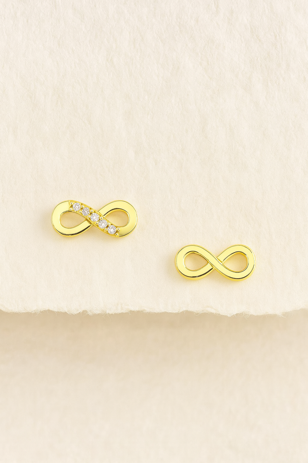 Brinco folheado a ouro 18k em formato de infinito, símbolo de eternidade e conexão. Um dos lados é liso e polido, enquanto o outro recebe aplicação de cristais que proporcionam brilho delicado e sofisticado.